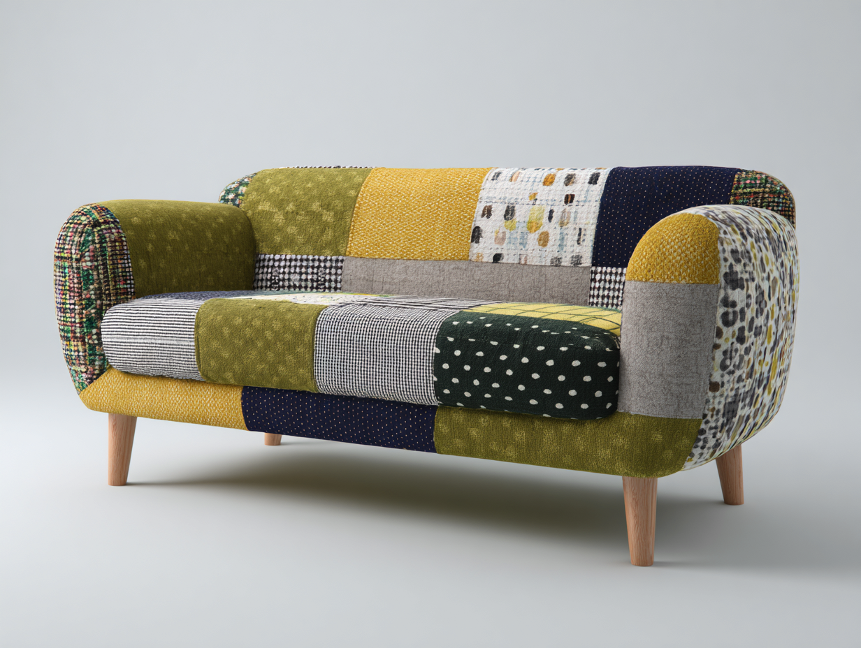 Dieses 2-Sitzer Sofa ist für den Einsatz im Wohnzimmer vorgesehen und zeichnet sich durch sein auffälliges Patchwork-Design aus. Unterschiedliche Stoffmuster sind zu einer dekorativen Oberfläche kombiniert und verleihen dem Möbelstück eine individuelle Ausstrahlung. Die kompakte Bauform eignet sich für kleinere Wohnräume oder als zusätzliche Sitzgelegenheit.