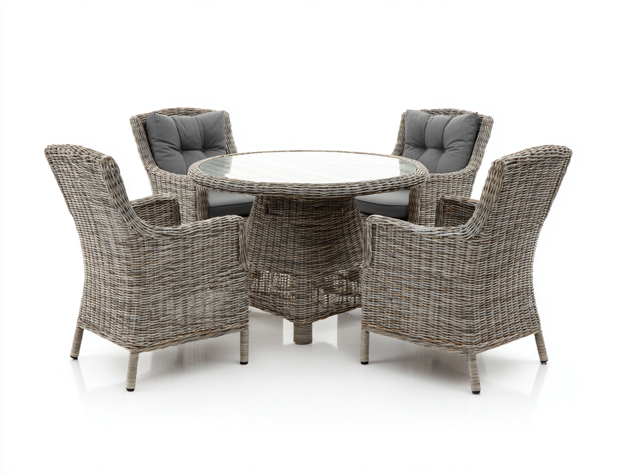 Diese Garten Essgruppe aus Polyrattan ist für Terrasse, Balkon oder Garten konzipiert. Die Kombination aus rundem Esstisch mit Glasplatte und Armlehnstühlen bildet eine kompakte Esslösung für den Außenbereich. Das natürliche Flechtmuster und die klare Formgebung passen zu unterschiedlichen Outdoor-Bereichen und schaffen einen funktionalen Essplatz im Freien.